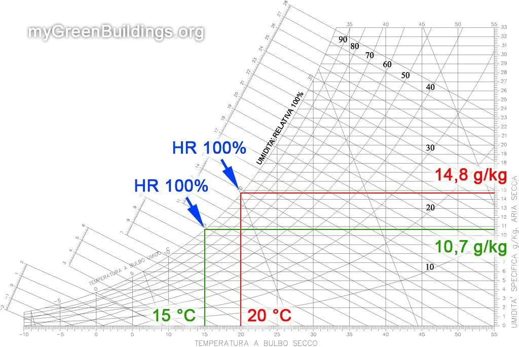 Ad esempio, secondo il diagramma psicrometrico, l’aria, a 20°C con 14,8 g di acqua/kg ha una umidità relativa del 100%. La stessa aria a 15 °C raggiunge il 100% di umidità relativa con solo 10,7 g di acqua/kg. L’aria più fredda riesce ad accumulare circa il 28% di vapore acqueo in meno rispetto all’aria più calda.