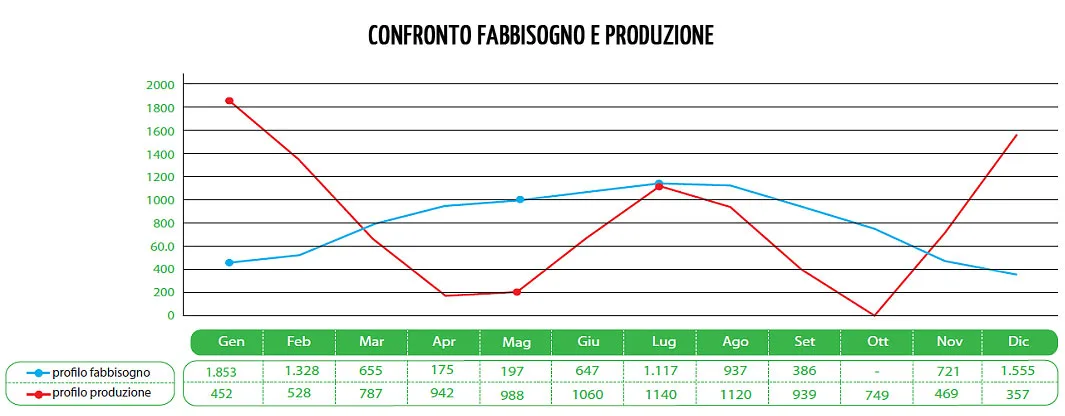 Tuttavia, nonostante i vantaggi sin qui mostrati, abbiamo rilevato che è impossibile ottenere i risultati richiesti dalla direttiva in quanto il profilo della produzione energetica dell’impianto ipotizzato coincide con il fabbisogno energetico dell’involucro solo nel caso di un bilancio totale sull’intero anno, ma non nei singoli mesi.