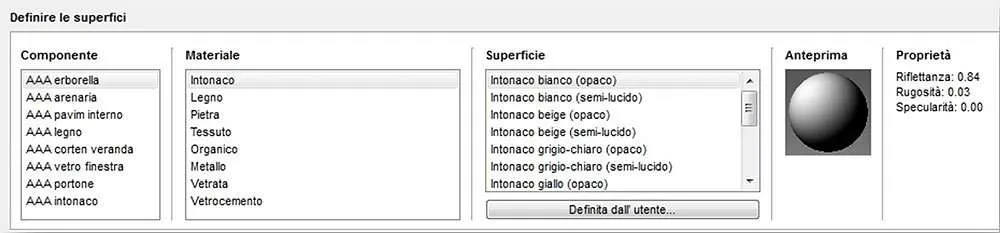 Nella parte bassa della schermata trovi delle finestre di selezione nelle quali si possono definire le superfici. Nel gruppo “Componente” clicca volta per volta il nome del layer, quindi di seguito assegna a ciascuno un materiale tra quelli a scelta e un tipo di finitura superficiale. Selezionando i materiali e le superfici messe a disposizione dal software hai già in automatico i valori di riflettanza, rugosità e specularità. Se invece volessi personalizzare la superficie in base ad esigenze specifiche basta cliccare il tasto “Definita dall’utente …” e quindi cambiare una o più proprietà del materiale.