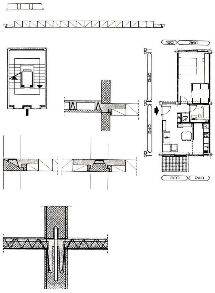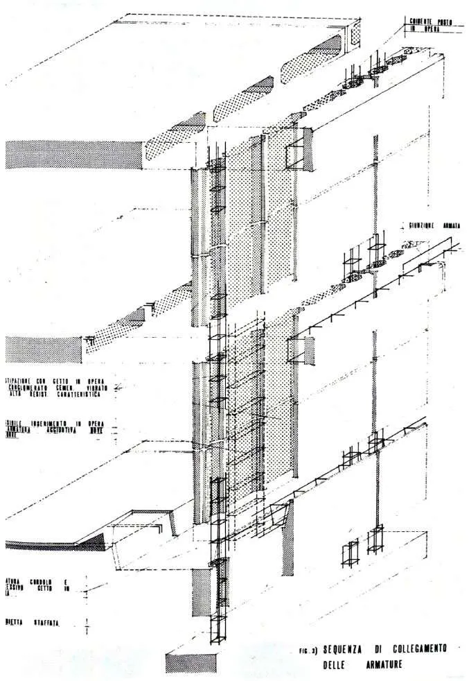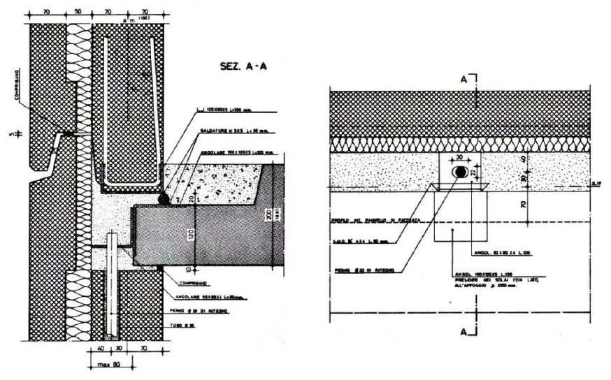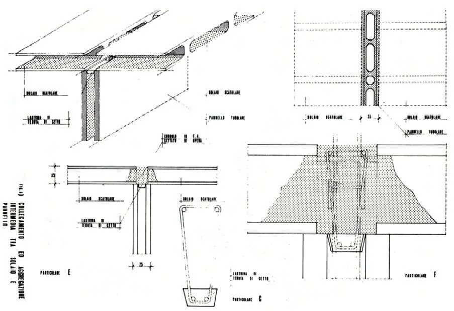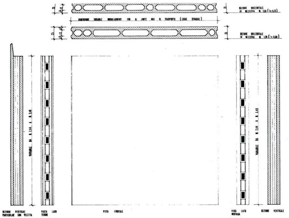 I pannelli portanti sandwich si ritrovano come multipli del modulo delle dimensioni 3,06 m in altezza e spessore 0,25 m e sono costituiti da due strati di parete esterni in cemento armato, divisi da una camera d’aria, e collegati da nervature ogni 60-75 cm. Si mostra l’unione delle due tipologie di pannello.