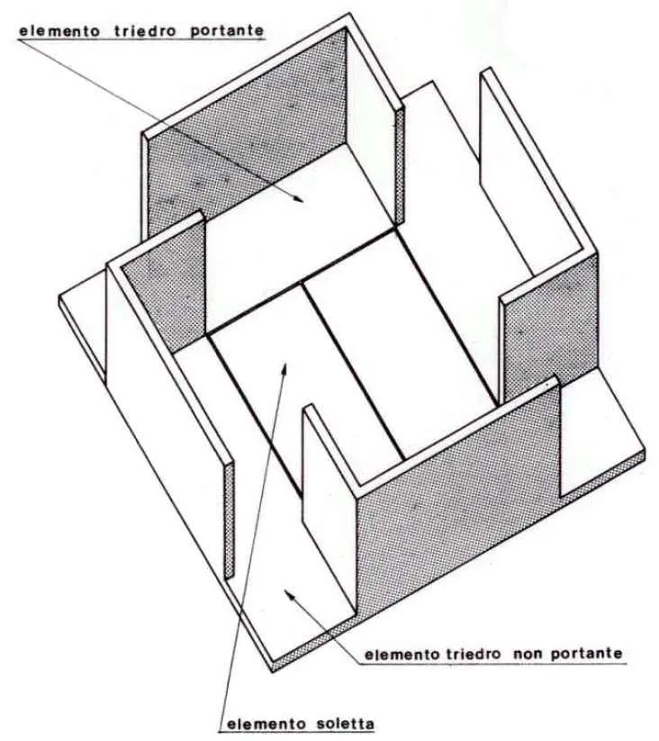 Il Triedro è un sistema tridimensionale brevettato per l’edilizia industrializzata civile, indirizzato al settore abitativo, commerciale, direzionale. Si basa sull’impiego di un elemento modulare spaziale costituito da tre pannelli piani che svolgono contemporaneamente la funzione architettonica e strutturale. All’elemento triedro si aggiungono altri componenti quali i pannelli di solaio, gli infissi, gli elementi divisori.