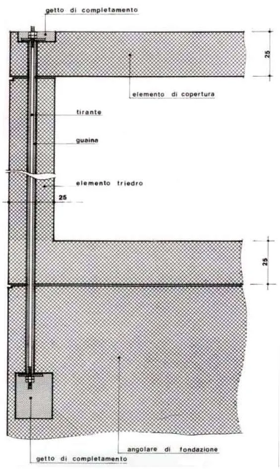I pannelli verticali sono vincolati superiormente ai giunti orizzontali dei solai tramite perni, inseriti in tubi d’opportuno diametro con riempimento di malta. Nei quattro angoli dei solai e nel centro dei lati sono previste delle piastre per garantire l’ancoraggio delle medesime ad altri pannelli formando delle chiavi elastiche a trasmissione di taglio.