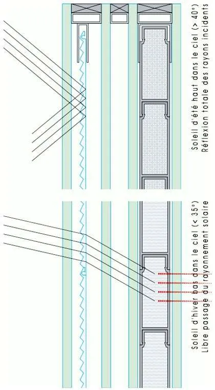 I raggi solari estivi con un’inclinazione maggiore di 40° vengono totalmente rifratti dall’elemento frangisole, mentre quelli invernali con un’inclinazione minore di 35° penetrano all’interno del sistema di facciata colpendo direttamente i pannelli PCM. Con questo sistema si assisterà nella stagione invernale a una cristallizzazione del materiale con conseguente opacizzazione della finestratura.