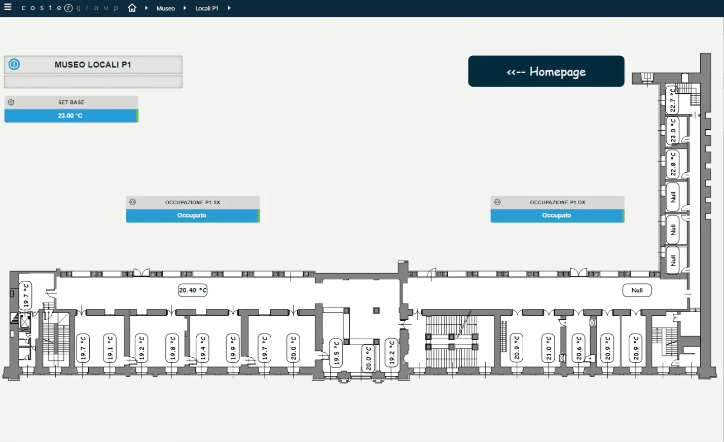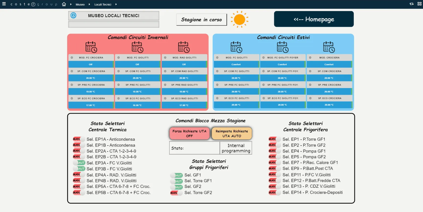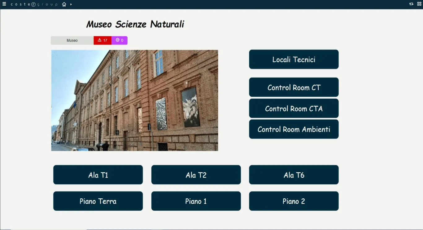 La soluzione messa in campo è costituita interamente da centraline e regolatori di produzione di Coster Group il cui protocollo di comunicazione digitale standard e aperto è Il Modbus al fine di garantire l’interoperabilità con altri devices presenti attualmente o installati in futuro e lasciando quindi all’Amministrazione del Museo, libertà completa di scelta della tecnologia.